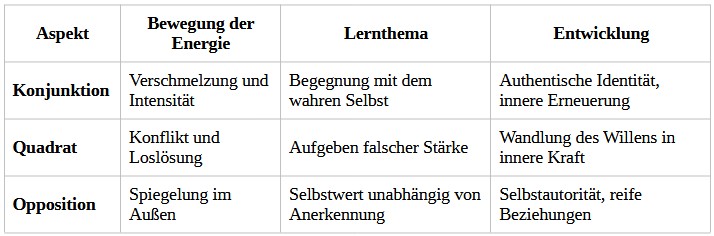 Während die Konjunktion nach innen wirkt und das Quadrat inneren Druck erzeugt, zeigt sich in der Opposition das eigene Thema verstärkt im Außen. Macht- und Ohnmachtserfahrungen treten über andere Menschen in Erscheinung – besonders in Partnerschaften, in Begegnungen mit Autoritäten oder in engen Beziehungen.