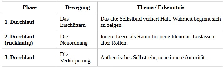 Die Angst, die hier auftaucht, ist die Angst, sich selbst zu verlieren. Doch genau diese Angst ist das Tor zur Wandlung. Sie zeigt an, dass das alte Ich zu eng geworden ist. Wenn man den Mut findet, diese Leere nicht sofort zu füllen, entsteht Raum für etwas Tieferes.